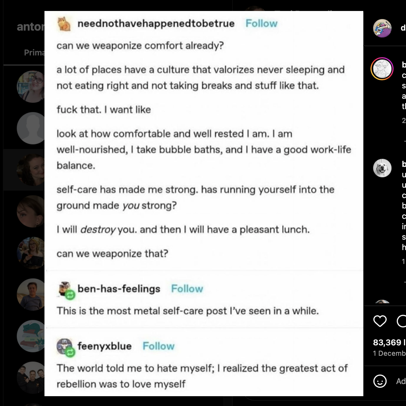 Anyway, let’s hope 2024 is a year of more balance for all of us because my attempts this year have definitely made me happier and made it easier to bounce back when stressful shit occurs. P.S I also got sick WAY less than I usually do…