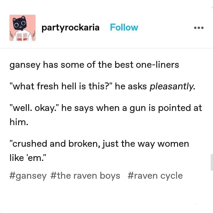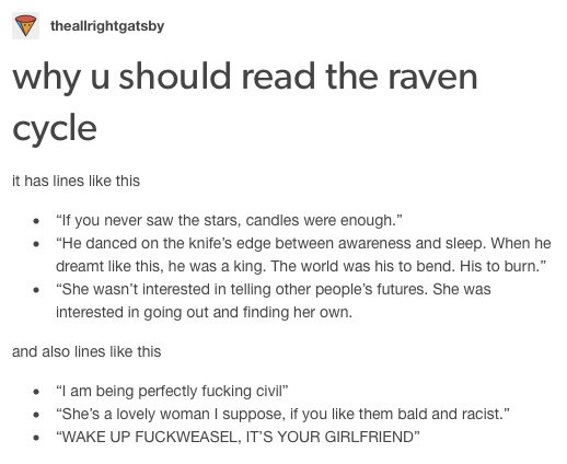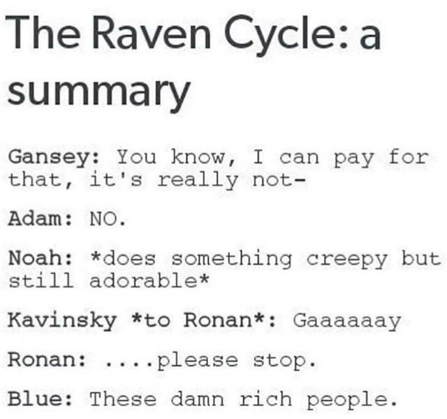 I read The Raven Cycle by Maggie Staifevater recently and whilst I realise I am very late to the game with this series, I wondered if there were other people like me who had never read it, so I went and found a bunch of totally contextless memes from Pinterest to convince you to join me.