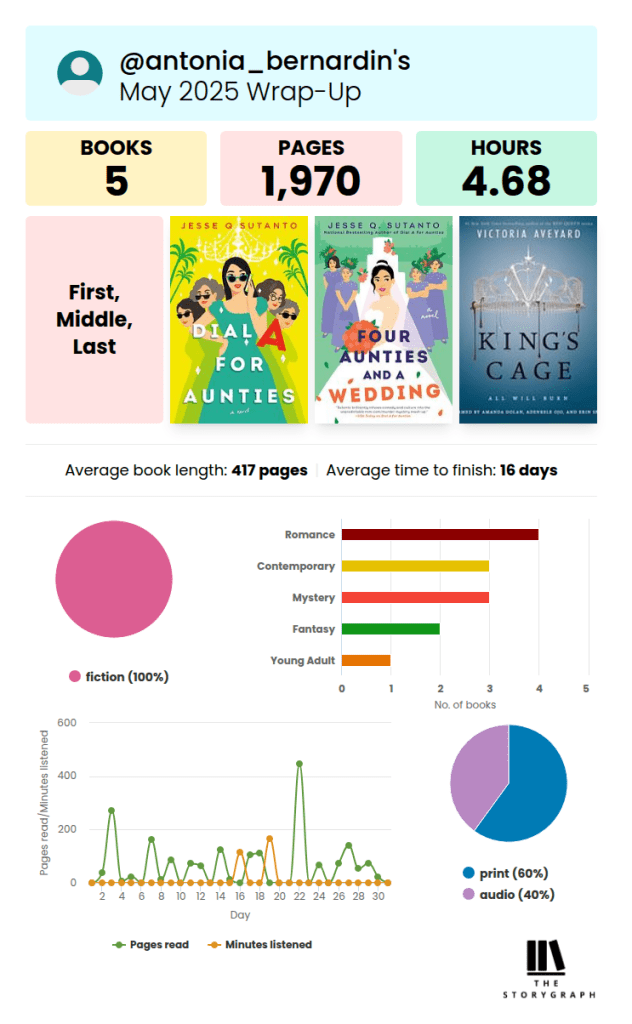 Dial A for Aunties by Jesse Q Sutanto was this month’s favourite, I actually read the whole series in May. I loved it, it’s funny, all about family and love but also just such a fun window into Chinese-Indonesian culture.