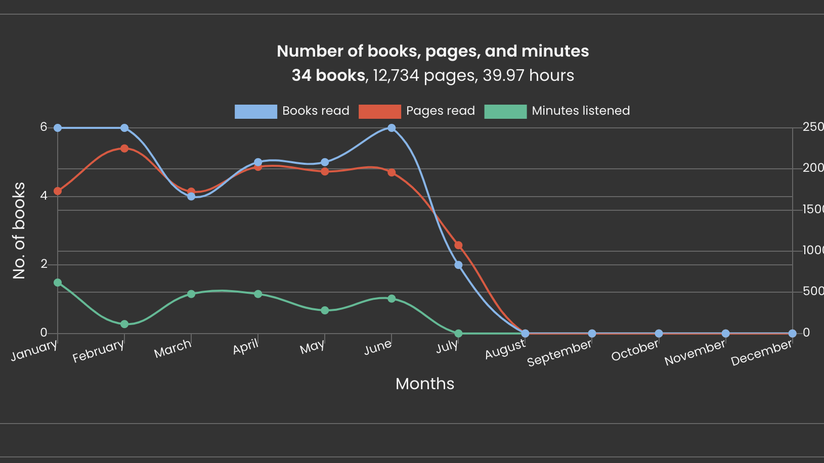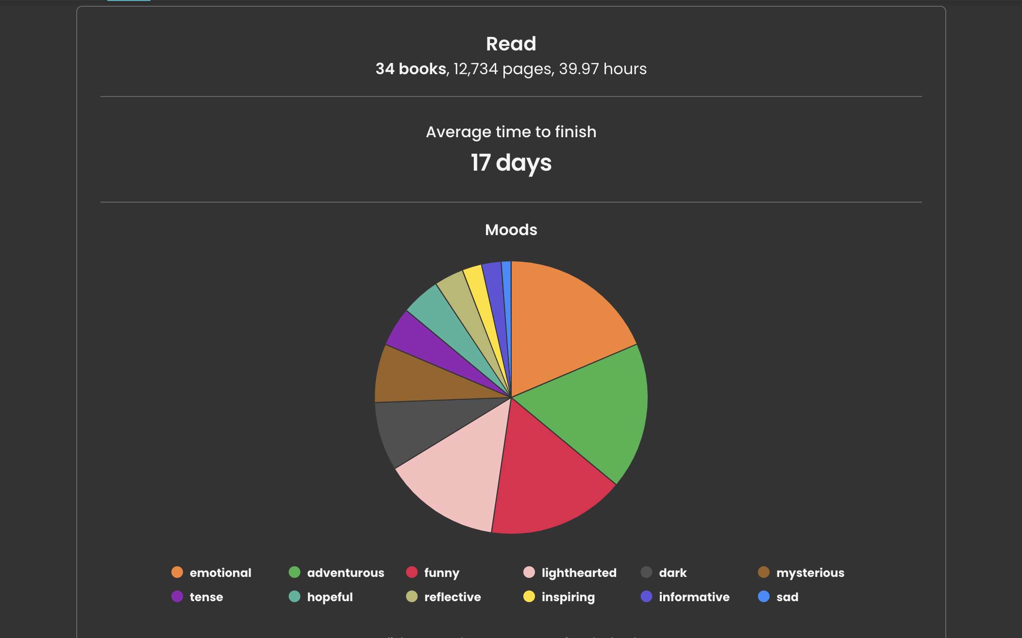 Overall, I’ve read 34 books, so that 100 books goal is looking a liiiitle unlikely but I’ve already been reading loads more since we settled into the house, so you never know.