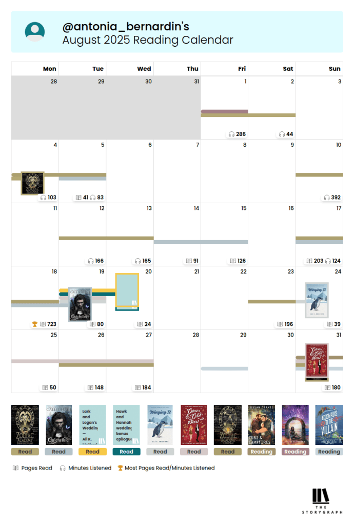 I read seven books in August and it’s a mix of some veryyy long ones and some short ones that bumped the total up. The biggest headline news is that I finally finished Zodiac Academy, so stand by for those reviews!